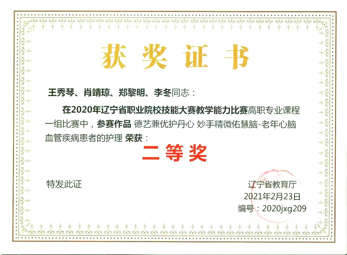 五、2020年王秀琴、肖靖琼、郑黎明、李冬获辽宁省职业院校技能大赛教师教学能力比赛二等奖。